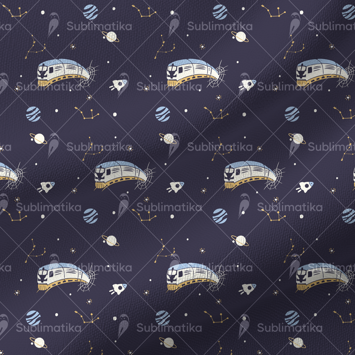 Space Train Pattern — a magical design featuring a train traveling through starry skies and galaxies. Perfect for kids’ fabrics, bedding, pajamas, and creative projects, adding a sense of adventure and wonder.