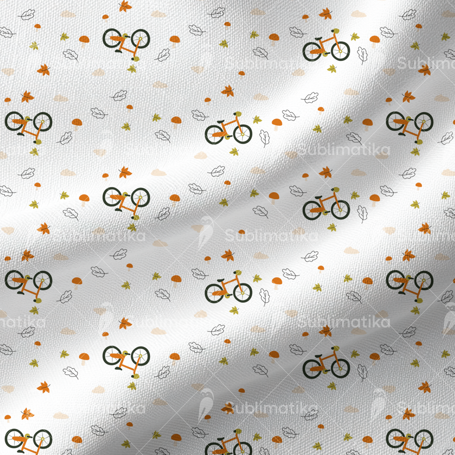 "Bicycle Forest" seamless pattern with bicycles and leaves. Perfect for fabric printing, wallpaper, stationery, packaging, and eco-friendly branding. Modern vector design for textile, fashion, and digital use. Looks great in combination with autumn collection prints.