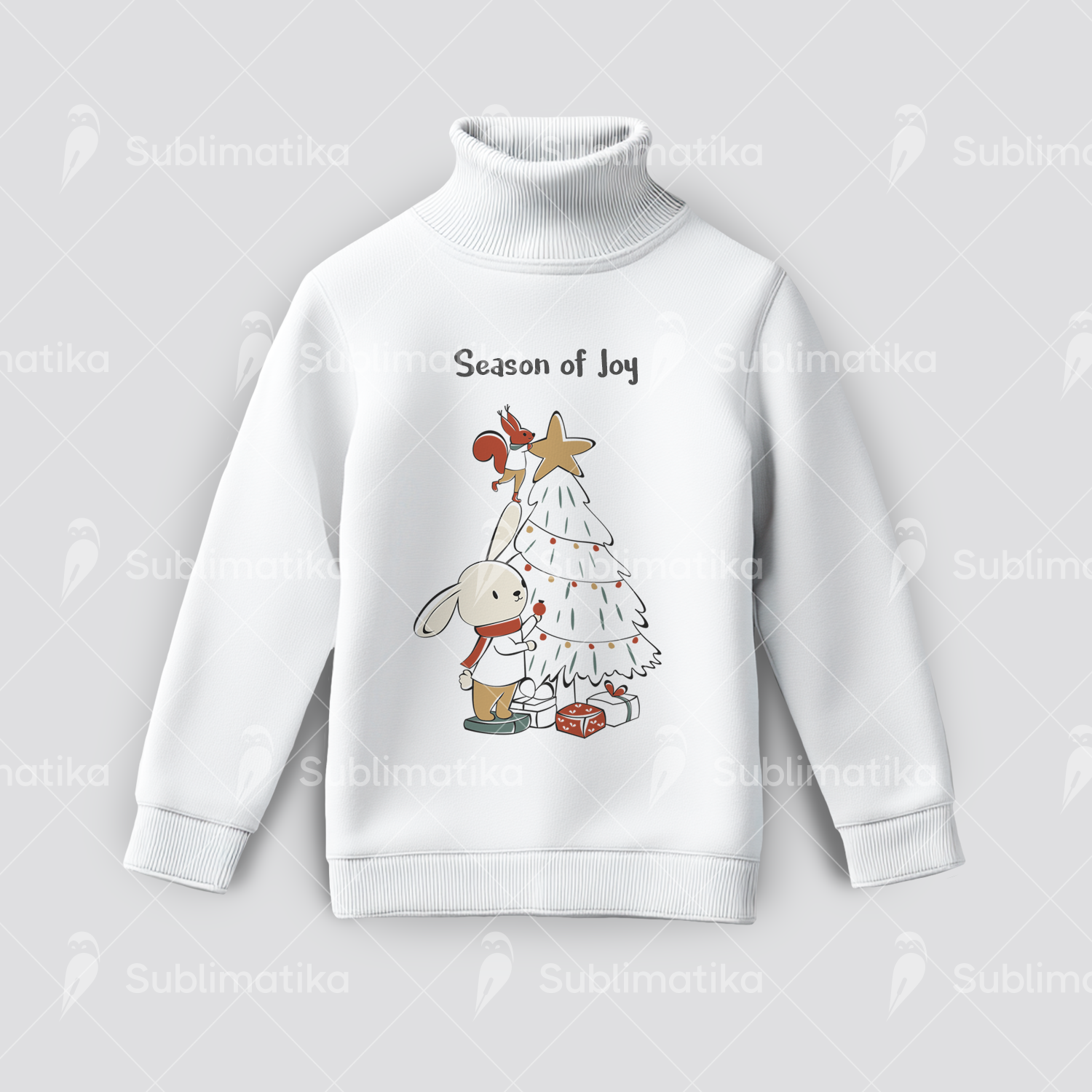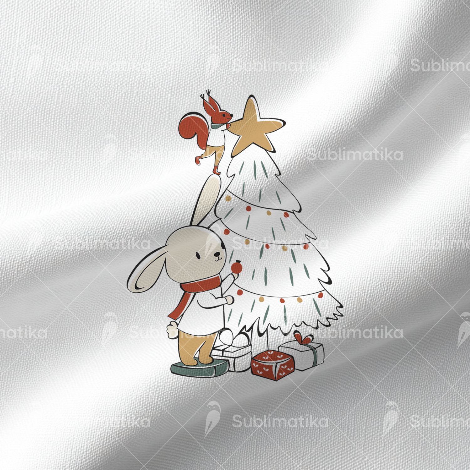 Christmas print featuring a cute bunny and squirrel decorating a festive tree. Perfect for holiday textiles, gift wrap, and seasonal designs. Coordinates beautifully with other patterns in the collection.