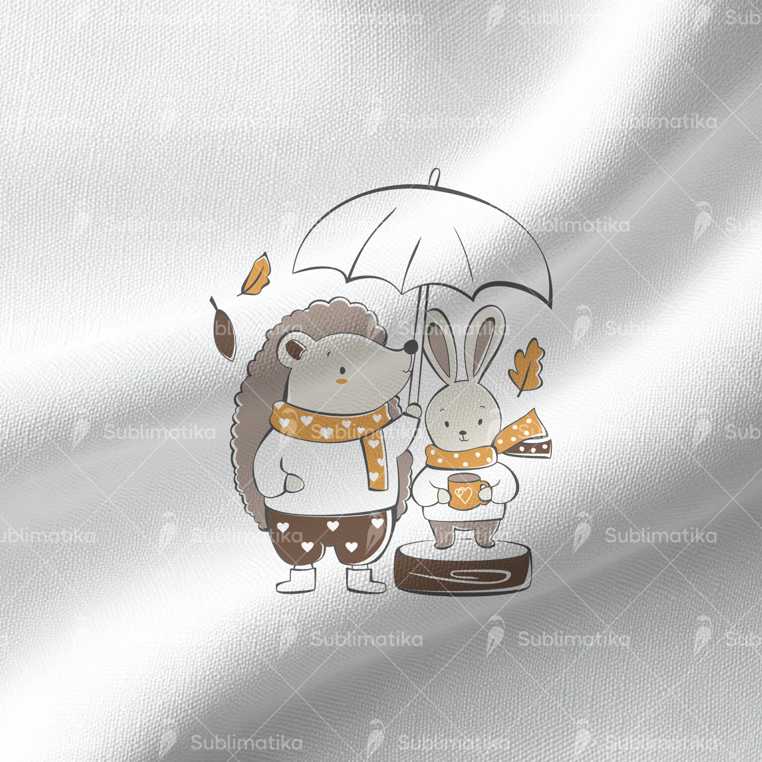 Hedgehog & Bunny in the Rain is a charming vector illustration featuring a cute hedgehog and bunny sharing one umbrella on a rainy day. Perfect for children’s textiles, greeting cards, and cozy autumn designs. The artwork comes in high-resolution vector format, ready for printing and commercial use.