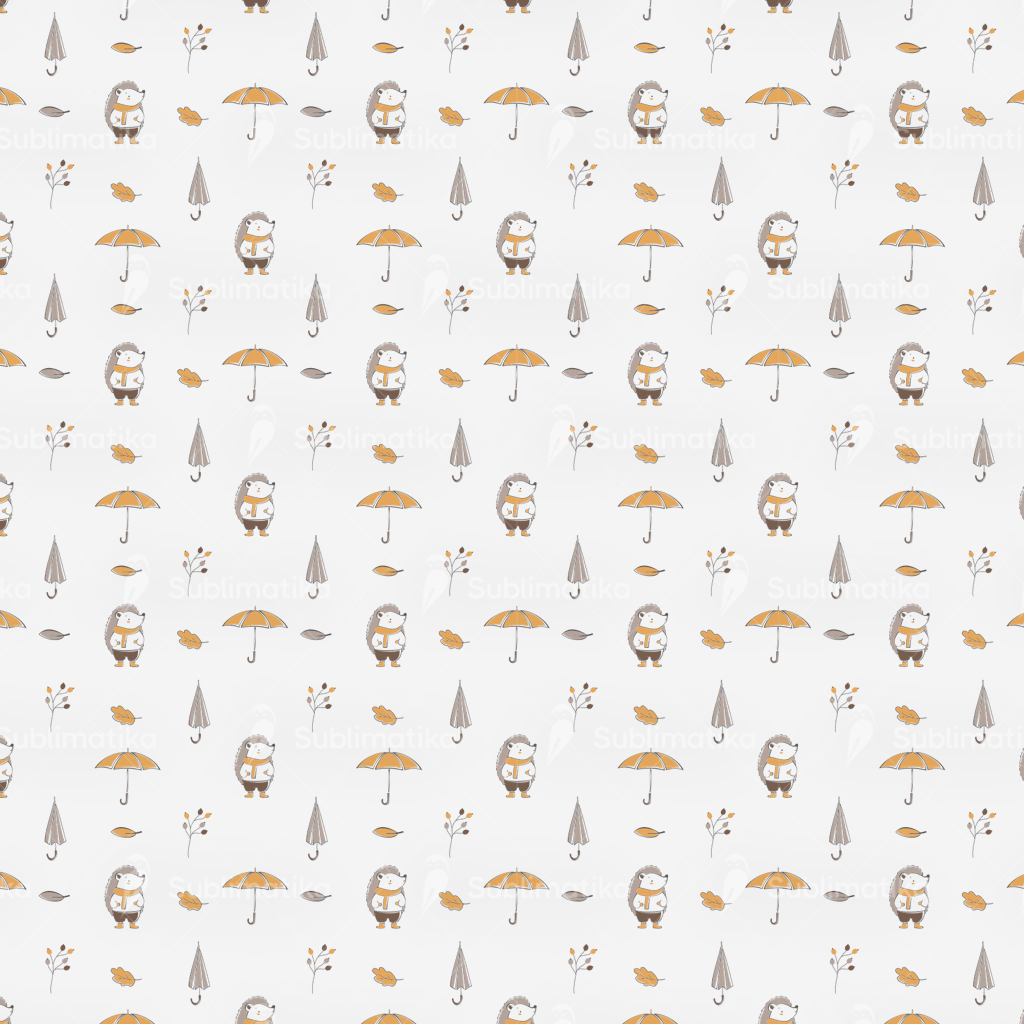 Cute seamless pattern with hedgehogs holding umbrellas. Soft, playful design perfect for children’s textiles, baby products, fabric printing, and cheerful lifestyle items.