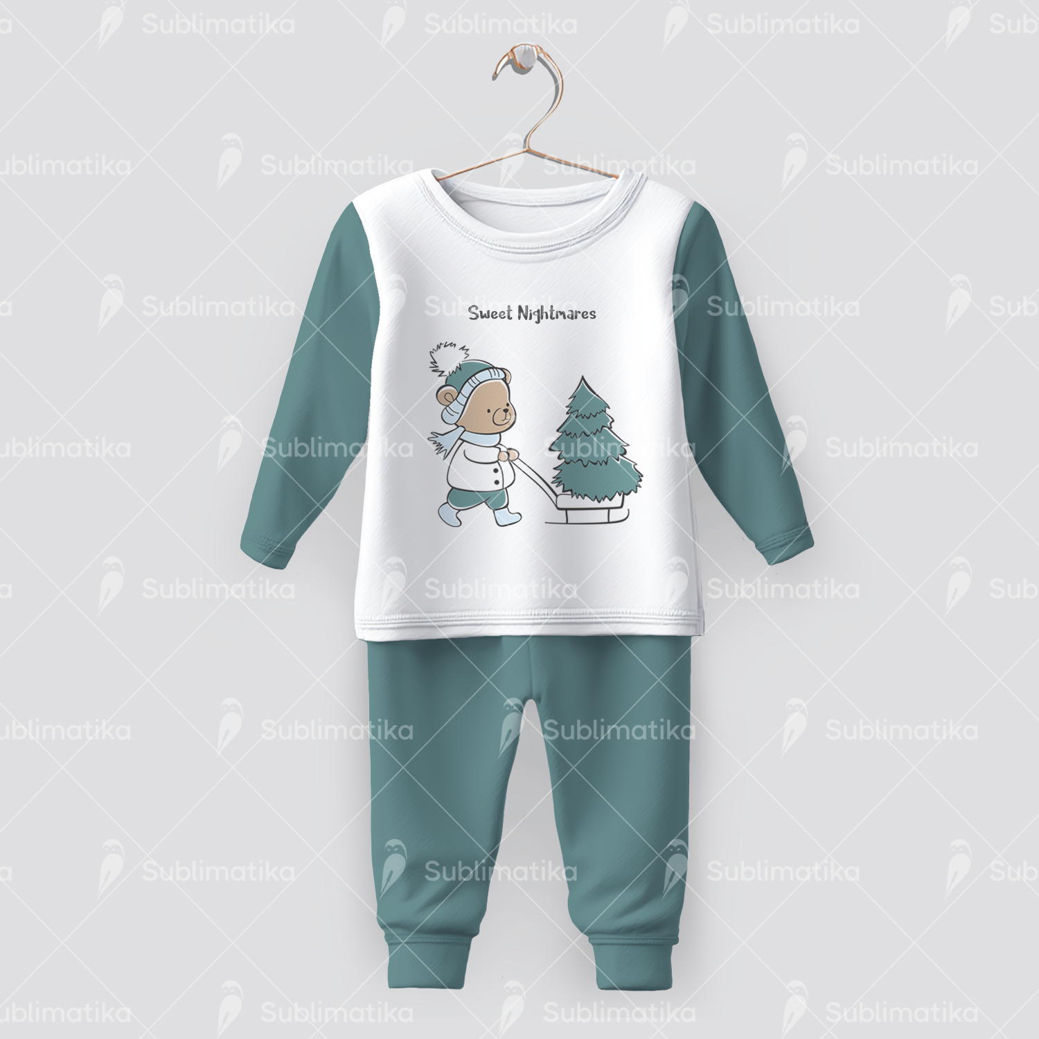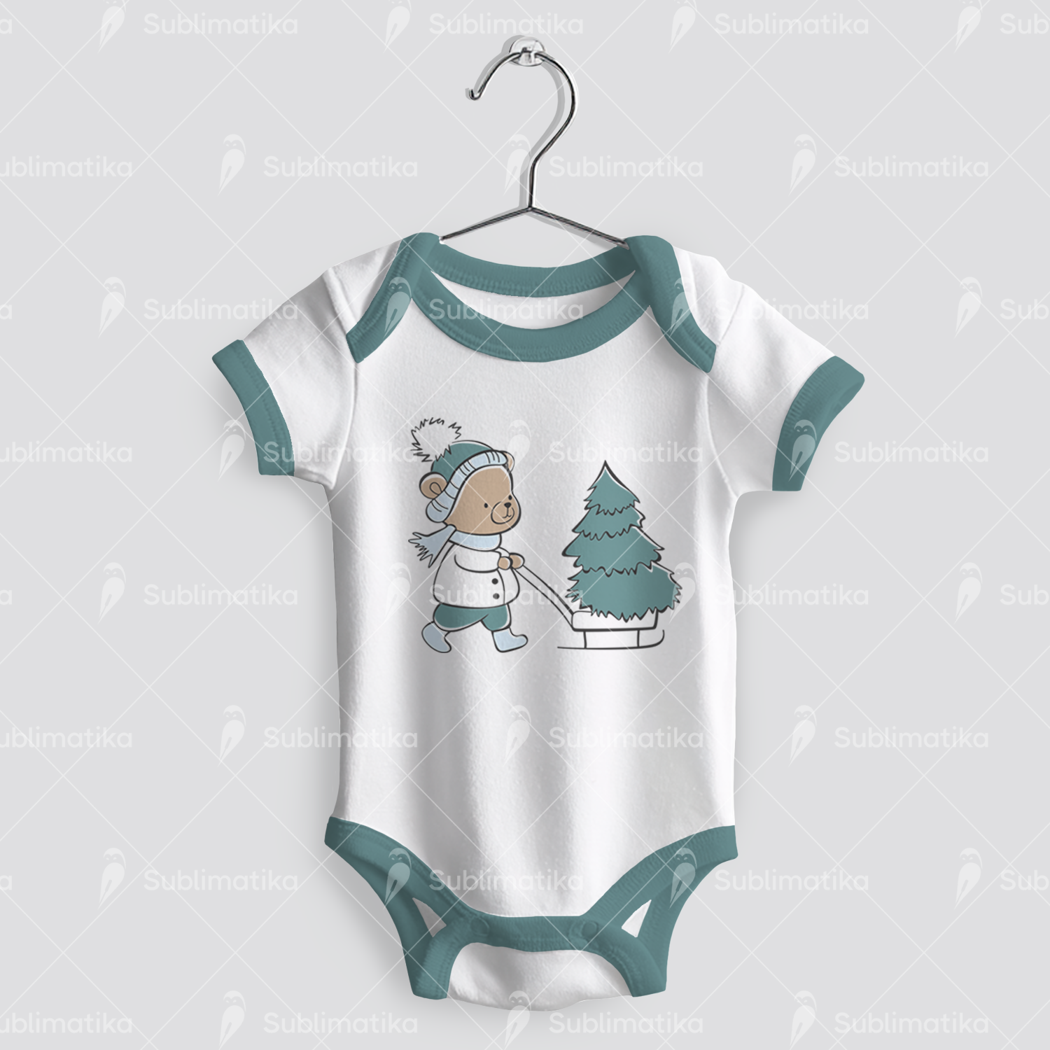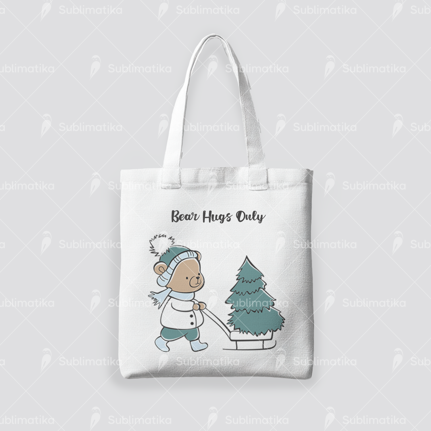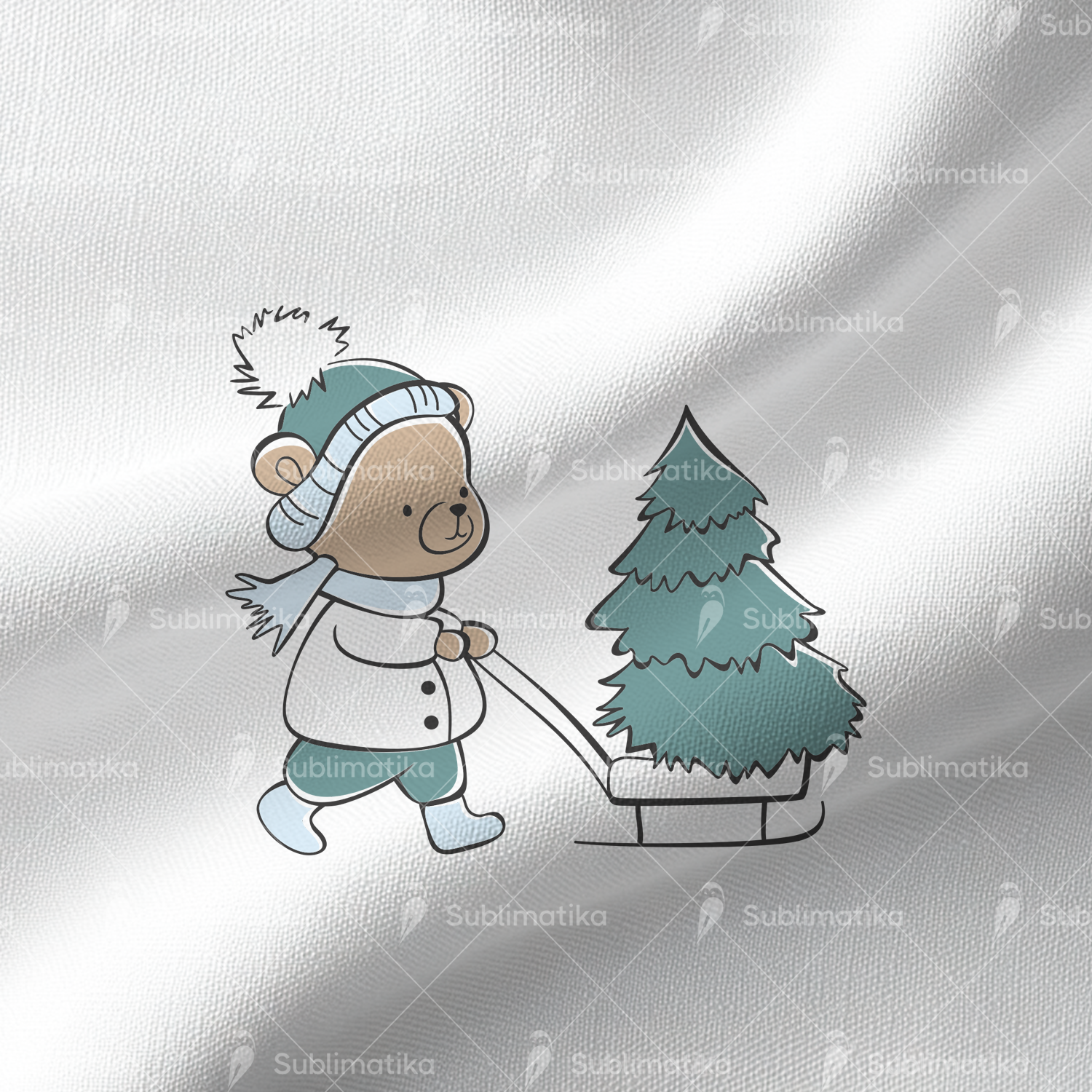 Cute illustration of a teddy bear with a Christmas tree, spreading holiday cheer.