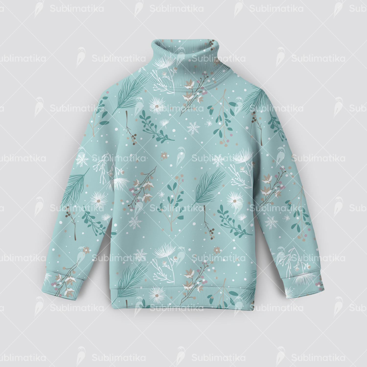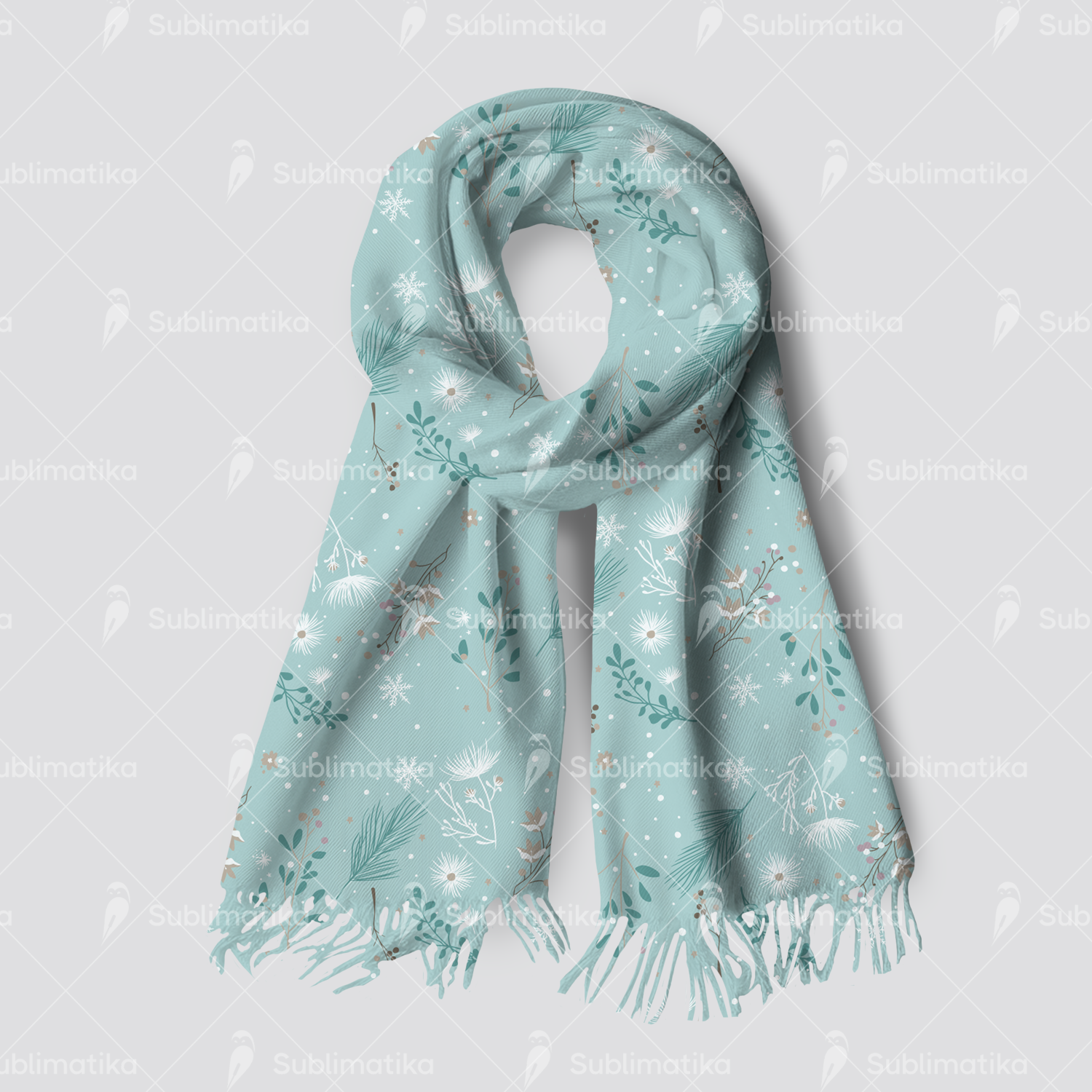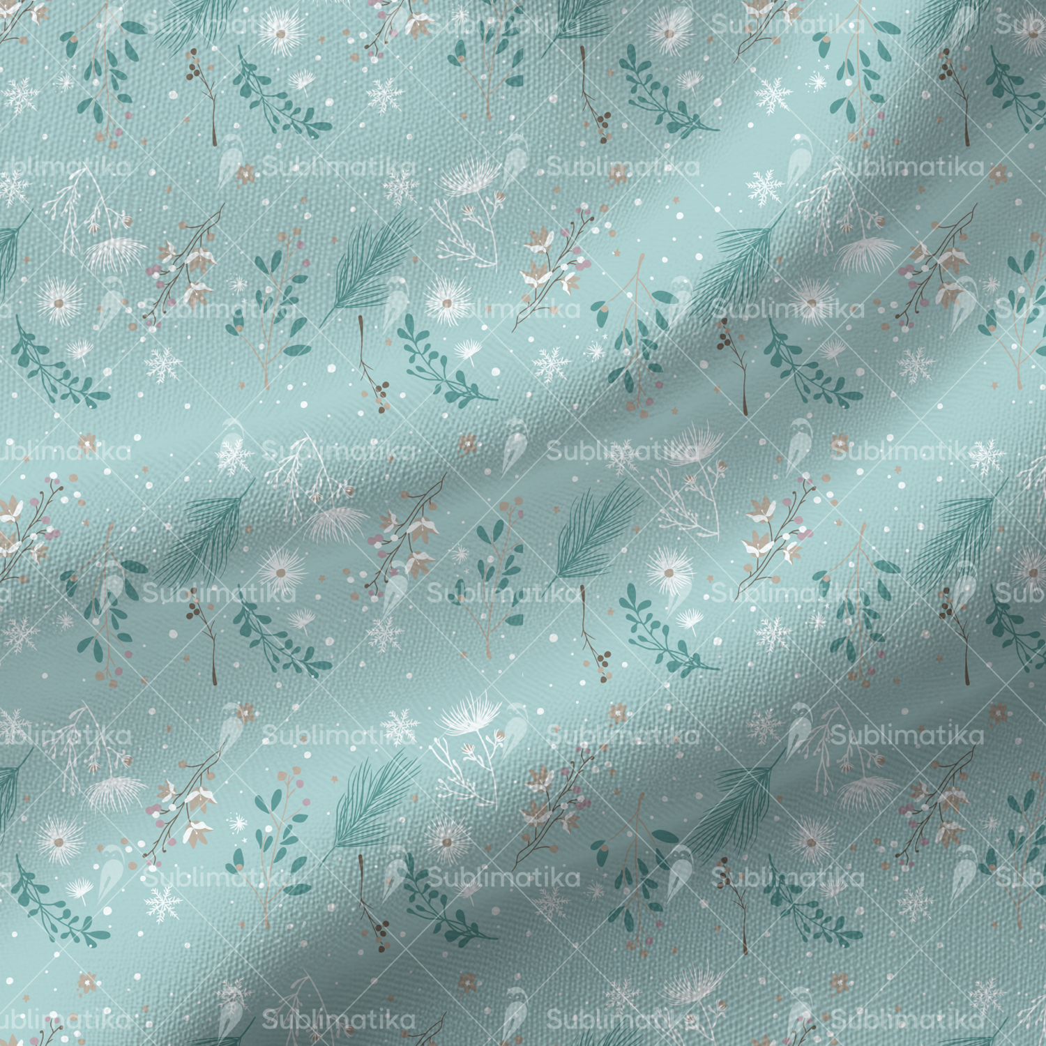 Delicate mix of winter flowers, pine branches, and snowflakes on a soft seasonal background. Perfect for textile design, wrapping paper, and elegant winter decor.